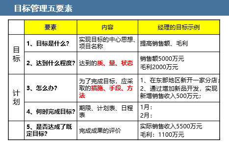 合格的目标应满足SMART原则、并从数量、质量、时间、成本以及上级或客户这五个维度衡量目标是否合理;学员们通过案例研讨,练习如何制定合理目标和逐级分解。