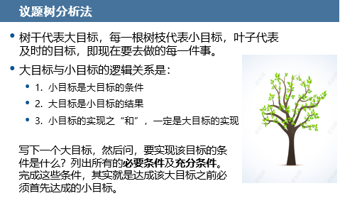 具体行动同样需要做计划,行动计划还会帮你确定:实现目标所需的资源及需要准备的活动,在满足MECE的原则下通过议题树的形式将大目标转化成具体举措。