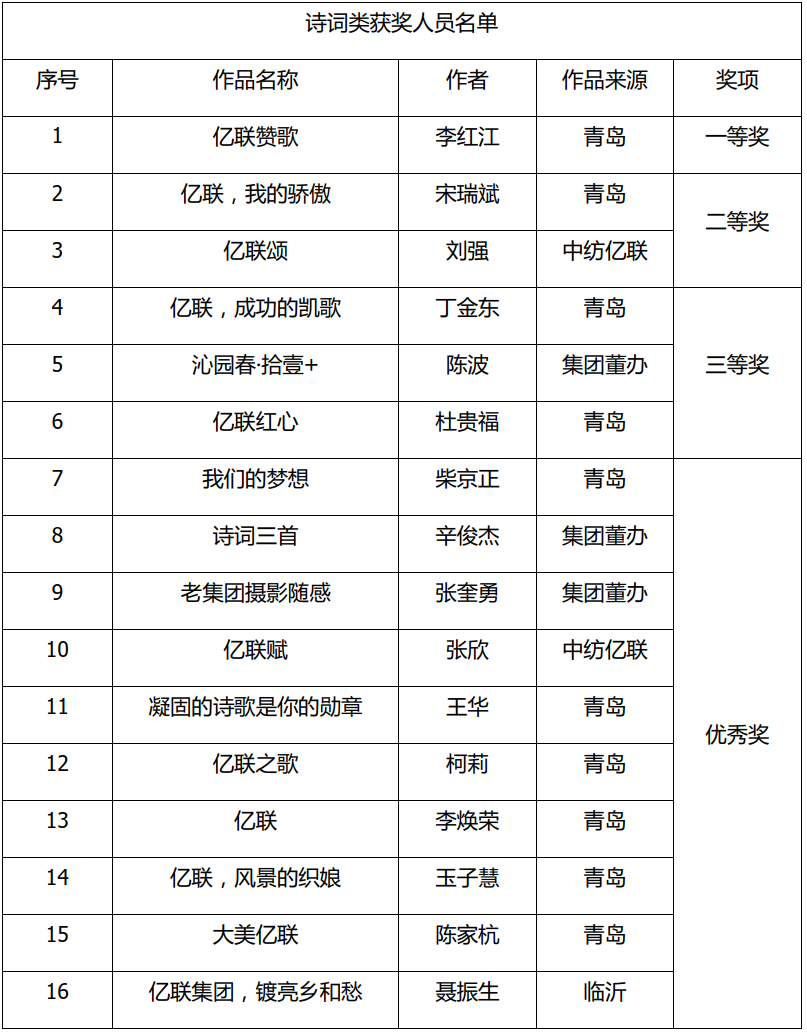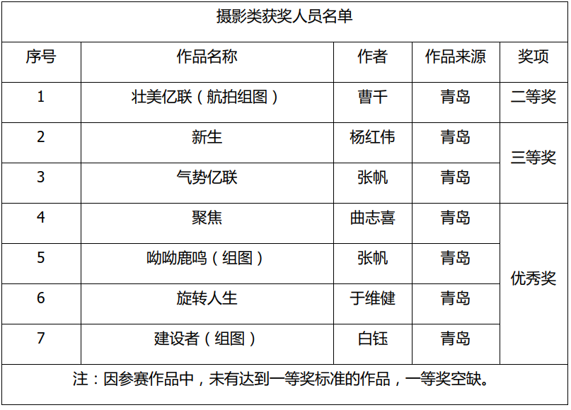 为客观、公正地进行评选,特邀请西海岸新区文联等单位有关专家,召开现场评审会,在充分考虑参赛作品数量、质量等情况下,共评出36名获奖人员,其中一等奖1名、二等奖5名、三等奖8名,优秀奖22名。具体名单如下: