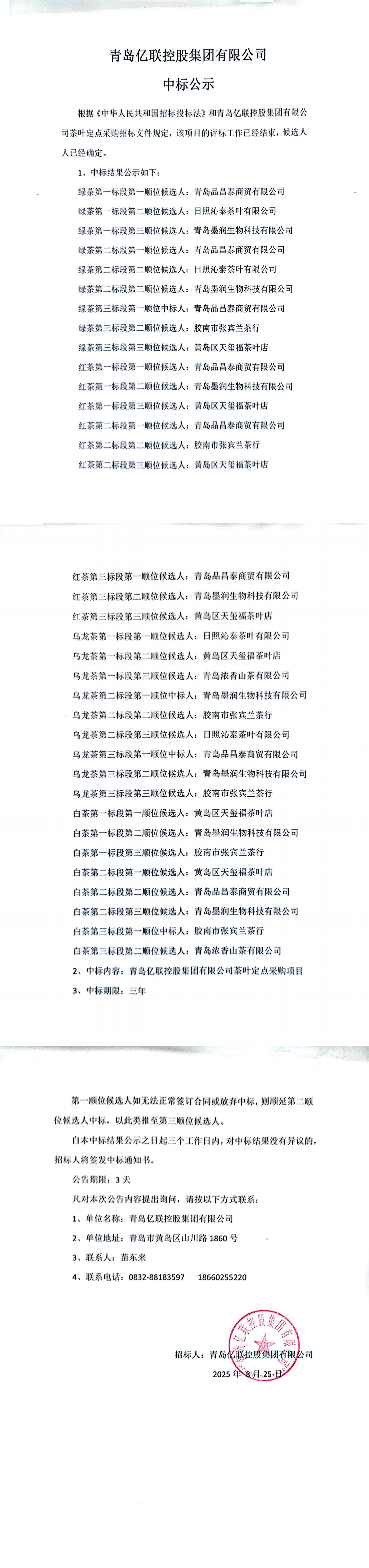 青岛亿联控股集团有限公司茶叶定点采购项目中标公示